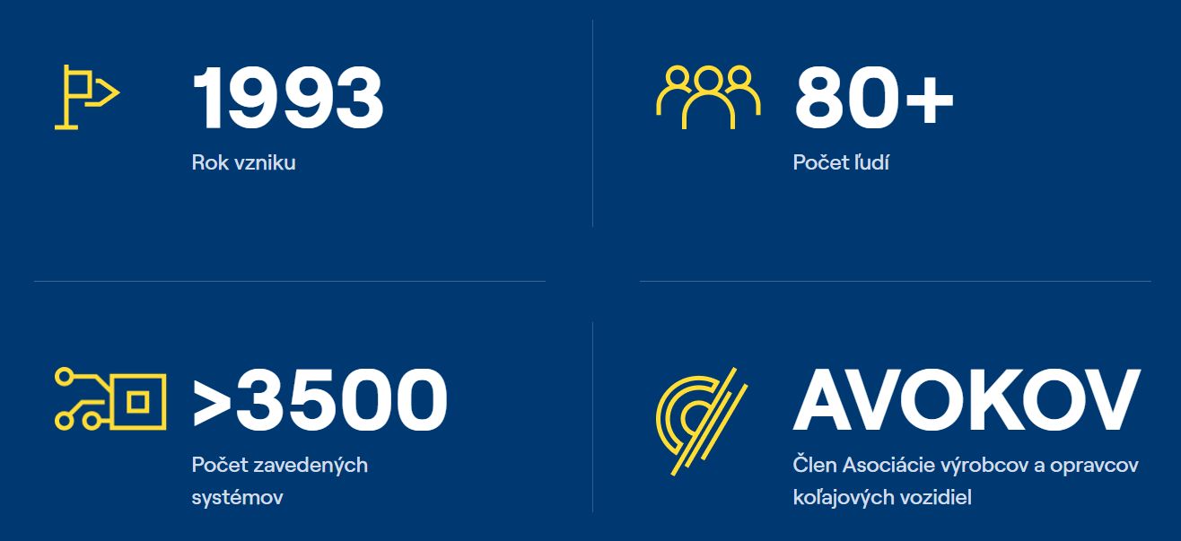 Sme vysoko špecializovaná technologická firma zo Slovenska s históriou od roku 1993. Zabezpečujeme komplexné technologické riešenia pre spoľahlivú a bezpečnú jazdu na železnici. Naše produkty chránia život, znižujú náklady a šetria čas. Sme dôveryhodným partnerom pre lídrov európskej železničnej dopravy. Neustále prinášame inovácie našich produktov a posúvame tak bezpečnosť lokomotív na novú úroveň.