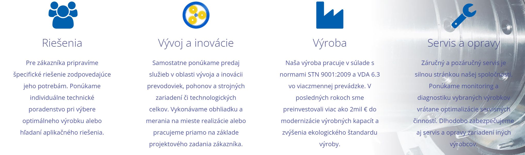 Sme inovatívna, inžiniersko výrobná spoločnosť so širokým portfóliom výrobkov zameraná na riešenia prevodových systémov v priemysle a strojných zariadení pre čistiarne odpadových vôd. Sme Vašim spoľahlivým partnerom už od roku 1990 a historicky čerpáme z viac ako päťdesiat ročnej tradície strojárskej výroby v Martine (SR).